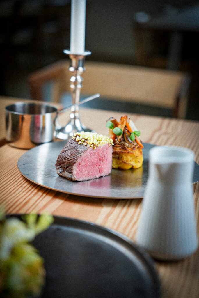 Rosastegt oksestriploin med pommes gratin, svampe og sauce bordelaise (laktose)